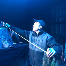 Director of Photography, Travis Jones works with a miniature set created by Devin Drake.