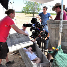 Preparing for the coffin scene on location in Luckenbach, TX.